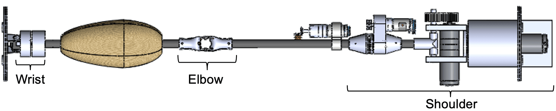 This project delivered a 6-DoF robotic arm with a 3-DoF shoulder, single-axis elbow, and 3-DoF wrist using a combination of direct-drive and tendon-pulley actuation, enclosed in an inflatable skin. I led mechanical design across all three joints.
